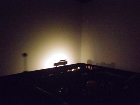 <h2>「恵比寿映像祭」開幕。LEDライト付きの鉄道模型を走らせることで床に置いたバケツや鉛筆など日用品の影が壁面に映し出されるようになっている</h2>
