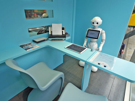 表参道駅近くのプロモーションスペース「Zero Base表参道」(港区南青山5)に3月24日、「Pepperだらけの携帯ショップ」が期間限定オープンした。