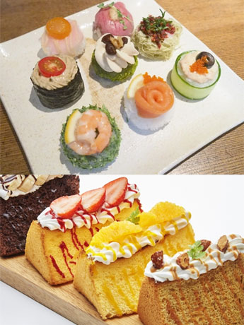 <h2>「onigiri stand Gyu!」で提供する一口サイズおにぎり「onigiri-petit(プチ)」と、「LAST CHIFFON」で提供するシフォンケーキをトースターで焼く「シフォントースト」のイメージ</h2>