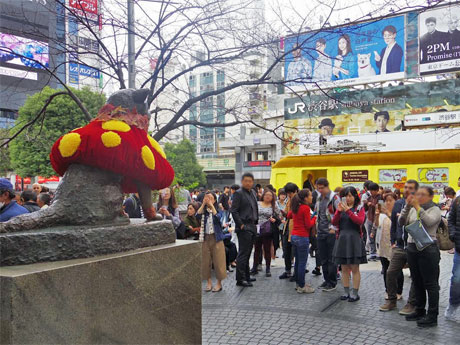<h2>渋谷・ハチ公像が一日限定「ドレスアップ」。ドレスアップしたハチ公像とポムポムプリン仕様の青ガエル</h2>