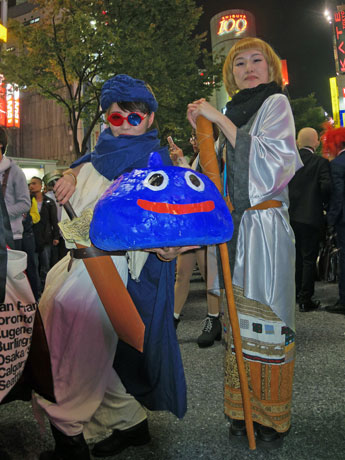 <h2>ハロウィーンの渋谷、最終日の本番も仮装姿で大混乱。ドラマ「勇者ヨシヒコ」のキャラクターに仮装した女性2人</h2>