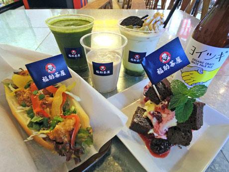 <h2>表参道に期間限定「福助茶屋」。福助人形のちょんまげをイメージしたホットドッグや和素材のドリンクなどを用意する</h2>