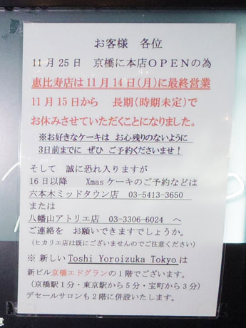 恵比寿駅東口エリアのパティスリー「Toshi Yoroizuka恵比寿店」(渋谷区恵比寿1)が11月15日から、無期休業する。