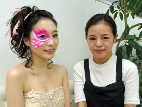 <h2>恵比寿のヘアセット&メーク店で「鳥メーク」。完成した「フラミンゴ」メークと手掛けた梅澤仁美店長(右)</h2>