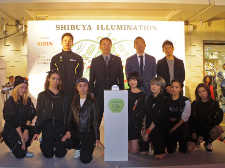 <h2>渋谷・ハチ公前広場にグリーンのイルミ。点灯式には観光大使のバスケ「サンロッカーズ渋谷」伊藤駿選手(上段左」やガールズユニット「FAMM'IN」(下段)らも出席</h2>