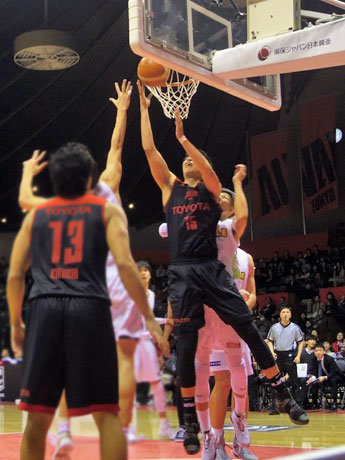 <h2>バスケBリーグ「アルバルク東京」、年内最後のホーム連勝。ゴール下で競り合う竹内譲次選手</h2>
