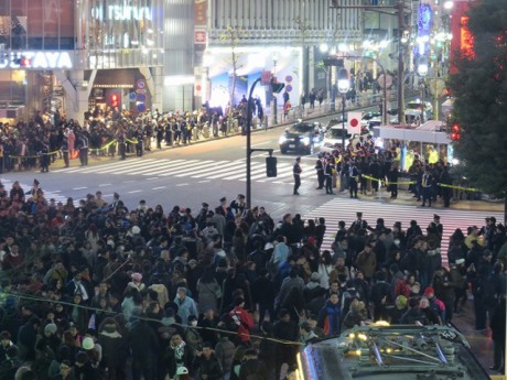 <h2>渋谷駅前でカウントダウン。写真は渋谷駅前交差点の歩行者天国化に向け22時に始まった車両通行禁止規制の様子</h2>