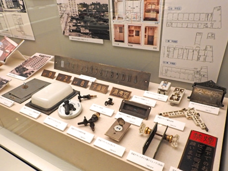 「なつかしき昭和の暮らし」展。「住宅と暮らし」コーナー。解体工事前に取り外した「宮益アパート」のエレベーター階表示板など。