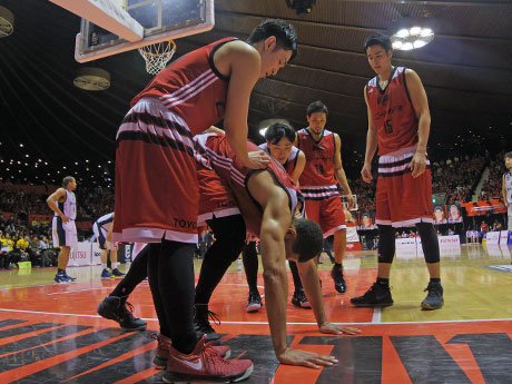 <h2>アルバルク東京、栃木に大勝。激しい接触で転倒したジェフ・エアーズ選手の元に駆け付けた選手たち</h2>