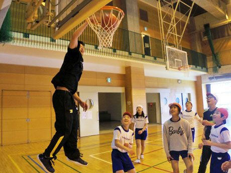渋谷区をホームタウンとする男子プロバスケチーム「サンロッカーズ渋谷(SR渋谷)」の藤高宗一郎選手が3月8日、同区立代々木山谷小学校(渋谷区代々木3)の体育授業でゲストティーチャーを務めた。
