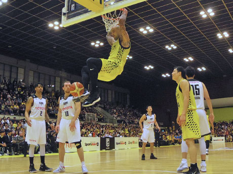 <h2>青山学院記念館でサンロッカーズ渋谷、アルバルク東京が「渋谷ダービー」。ダンクを決めたSR渋谷ロバート・サクレ選手(写真中央)</h2>