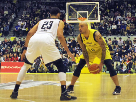 <h2>サンロッカーズ渋谷VSアルバルク東京。元NBA同士のジェフ・エアーズ選手(手前)とロバート・サクレ選手(奥)のマッチアップも見られた</h2>