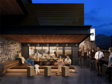 <h2>渋谷にテイクアンドギヴ・ニーズのホテル、5月開業へ。併設する立ち飲みスタイルの串焼き店のイメージ</h2>