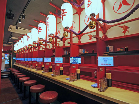 <h2>渋谷・道玄坂に家系ラーメン「壱角家」激辛専門店。前方に料理を運ぶレーンを設置したカウンター席</h2>