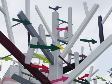 <h2>矢印サインで帰宅困難者を誘導する「シブヤ・アロー・プロジェクト」。一時退避場所の方向を示す矢印</h2>