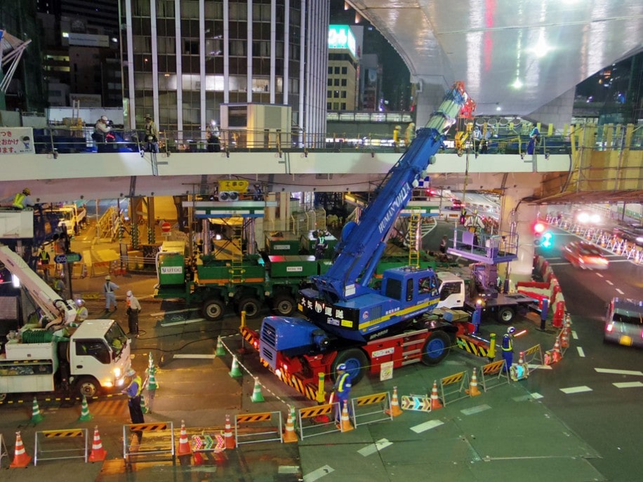 深夜の渋谷駅東口交差点で歩道橋架け替え工事