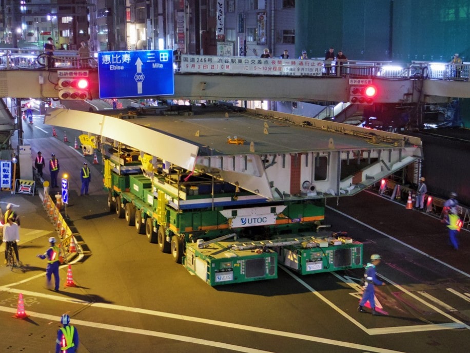渋谷駅周辺整備事業による歩道橋架け替え工事が続く渋谷駅東口交差点で9月2日深夜(=3日)、国道246号と明治通りを一部通行止めにして新しい橋桁を架設する大規模な工事が行われた。