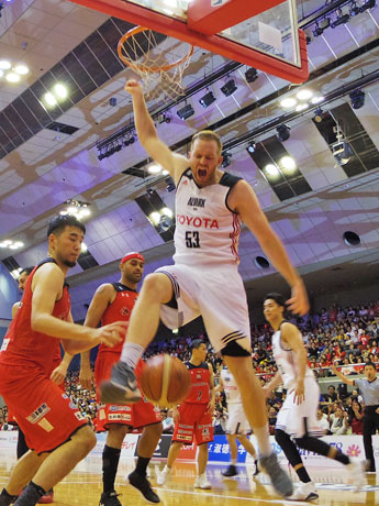 <h2>アルバルク東京、Bリーグ「アーリーカップ」優勝。豪快なダンクを決め雄叫びを上げたアレックス・カーク選手(中央)</h2>