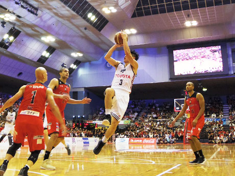 <h2>アルバルク東京、Bリーグ「アーリーカップ」優勝。フェイダウェイを決めるなどした安藤誓也選手(中央)</h2>