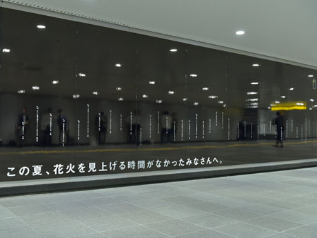 <h2>渋谷駅地下で「スマホ花火大会」。掲出されているのは花火大会名だけが記載されている真っ黒なポスター</h2>