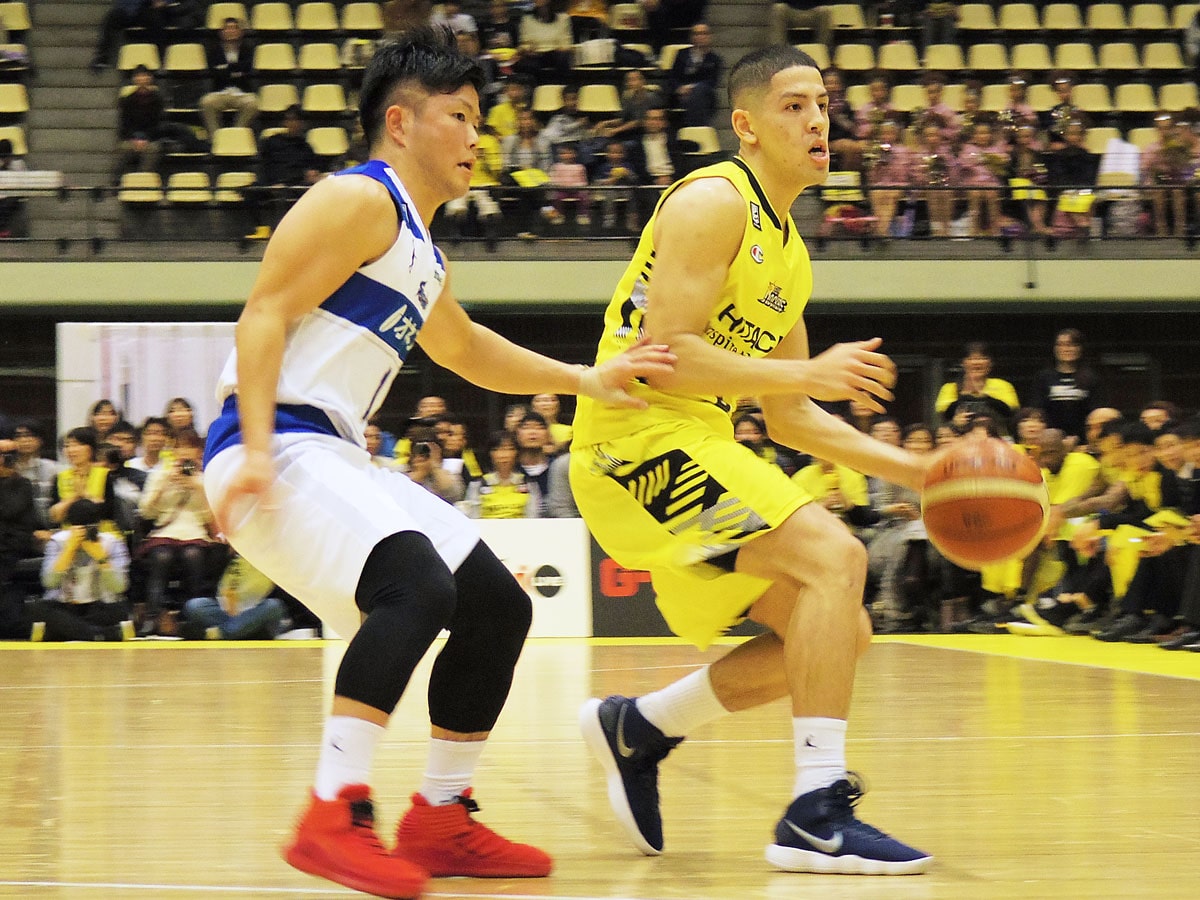 <h2>サンロッカーズ渋谷が6連勝。同級生マッチアップとなったベンドラメ礼生選手(写真右)と島根・岡本飛竜選手(同左)</h2>
