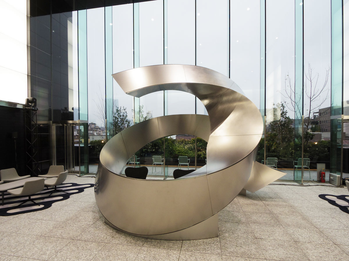 <h2>青山通り沿い「エイベックス」新社屋完成。ロゴ型のカウンターを採用する受付</h2>