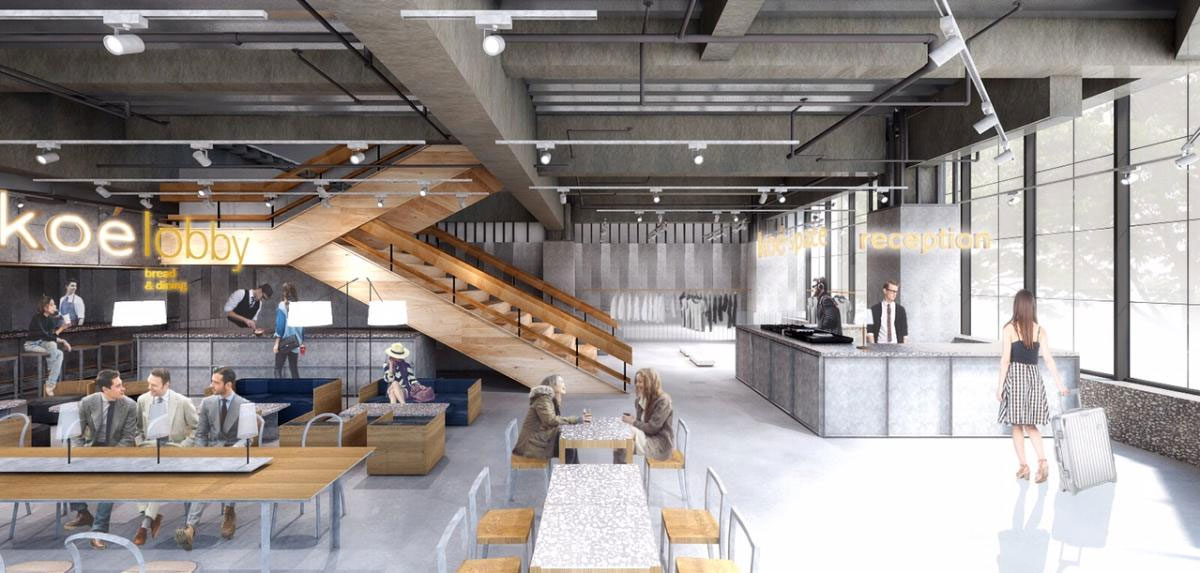 <h2>公園通りにホテル・アパレルショップ併設「koe」旗艦店。ベーカリーレストランやホテル受け付けを備える1階のイメージ</h2>