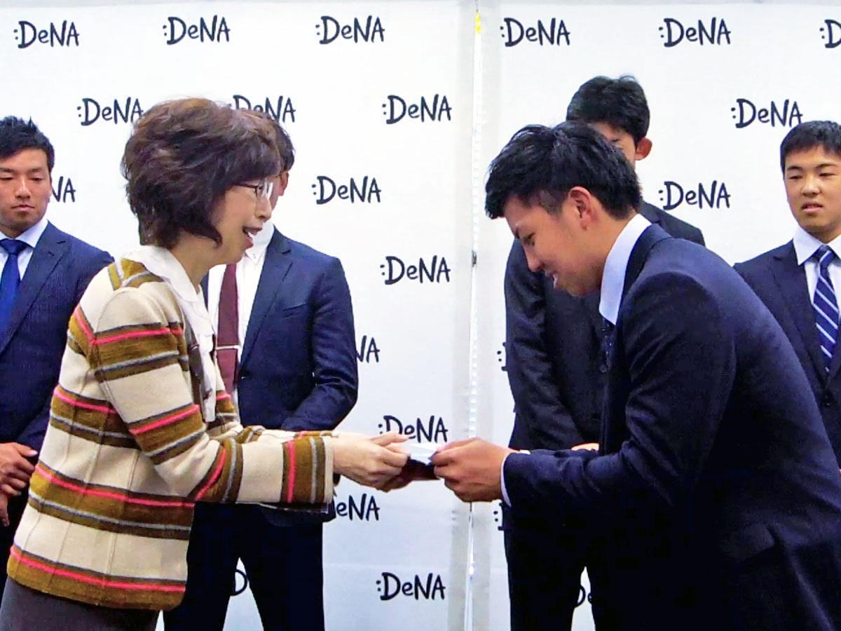 ディー・エヌ・エー本社(DeNA、渋谷区渋谷2)に1月19日、プロ野球球団「横浜DeNAベイスターズ」の新入団選手が来社した。