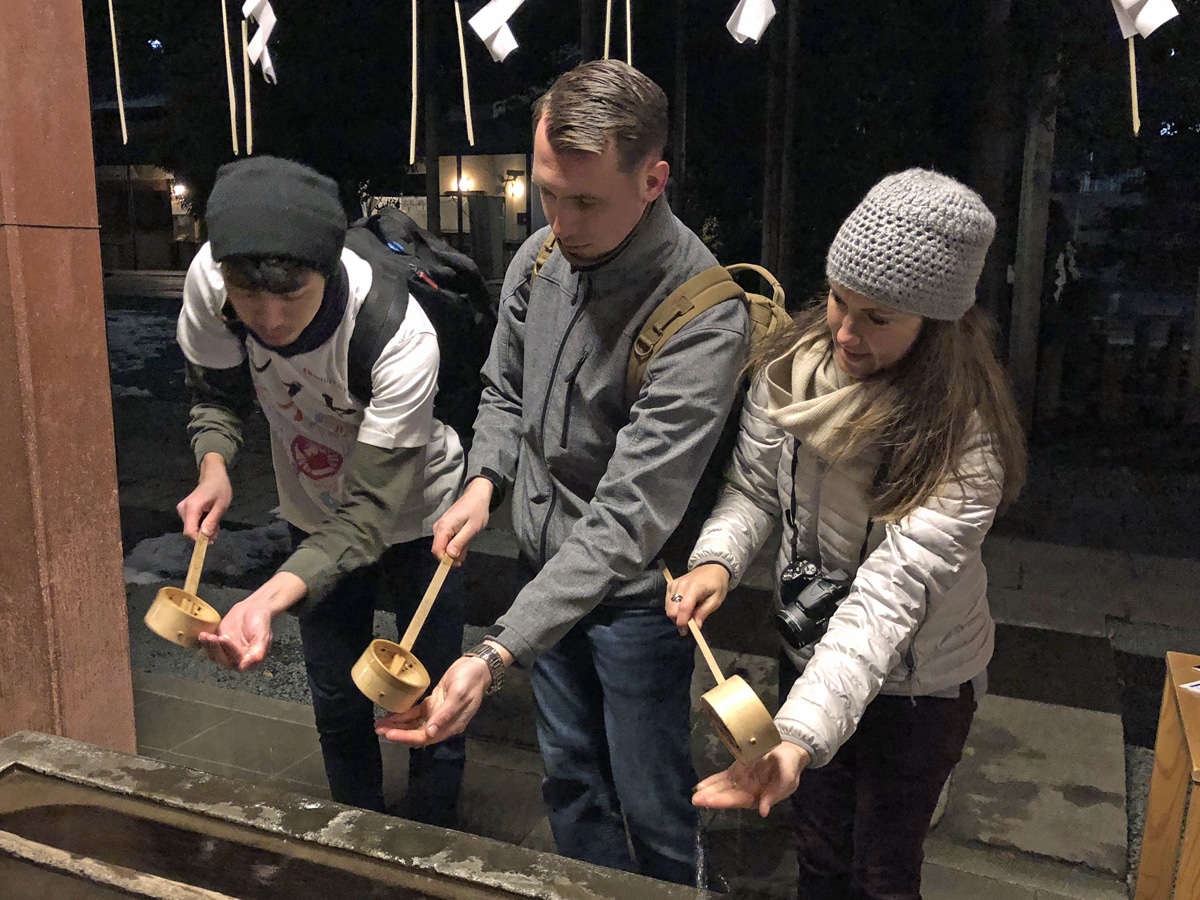<h2>金王八幡宮の手水場(ちょうずば)で、ひしゃくを使って手と口を清める</h2>