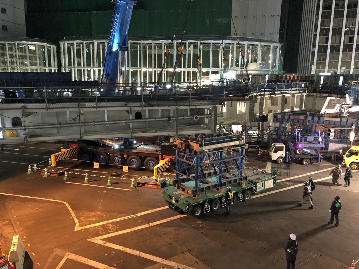 歩道橋架け替え工事が続く渋谷駅東口交差点で1月28日深夜(=29日)、明治通り(渋谷駅東口〜並木橋間)を通行止めにして新しい橋桁を架設する大規模な工事が行われた。