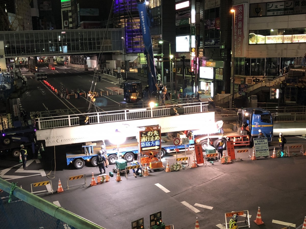 歩道橋架け替え工事が行われている渋谷駅東口交差点で2月11日深夜(=12日)、明治通り(渋谷駅東口交差点〜宮益坂下交差点間)を通行止めにして既設の歩道橋を撤去する大規模な工事が行われた。