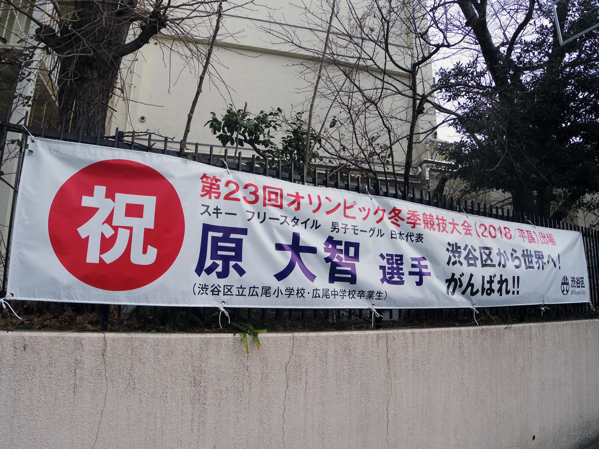 <h2>渋谷区生まれ・男子モーグル原大智選手が銅メダル。母校・広尾中学校の外壁に掲出している横断幕</h2>