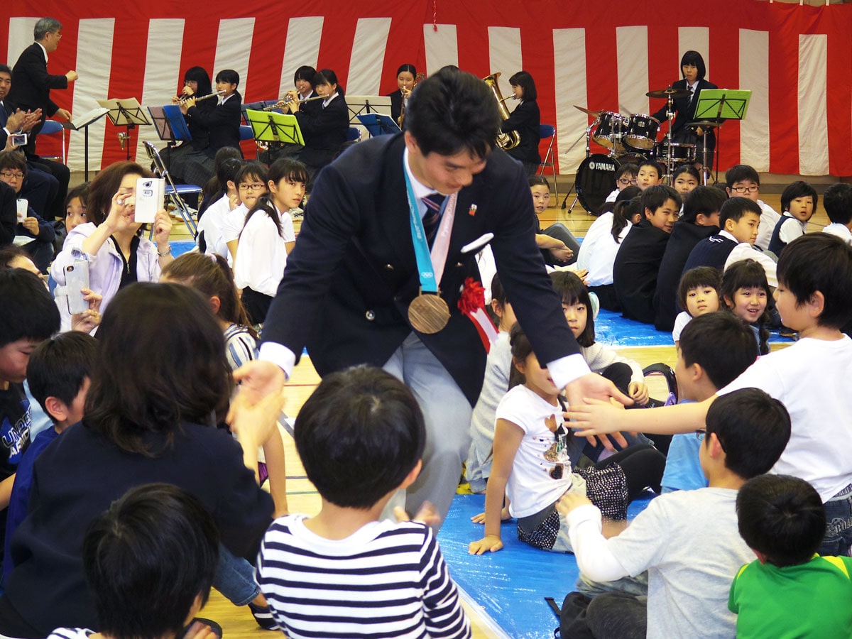 平昌冬季オリンピック大会で銅メダルを獲得したフリースタイルスキー男子モーグルの原大智選手が3月29日、母校である渋谷区立広尾中学校(渋谷区東4)で開かれた報告会に出席した。