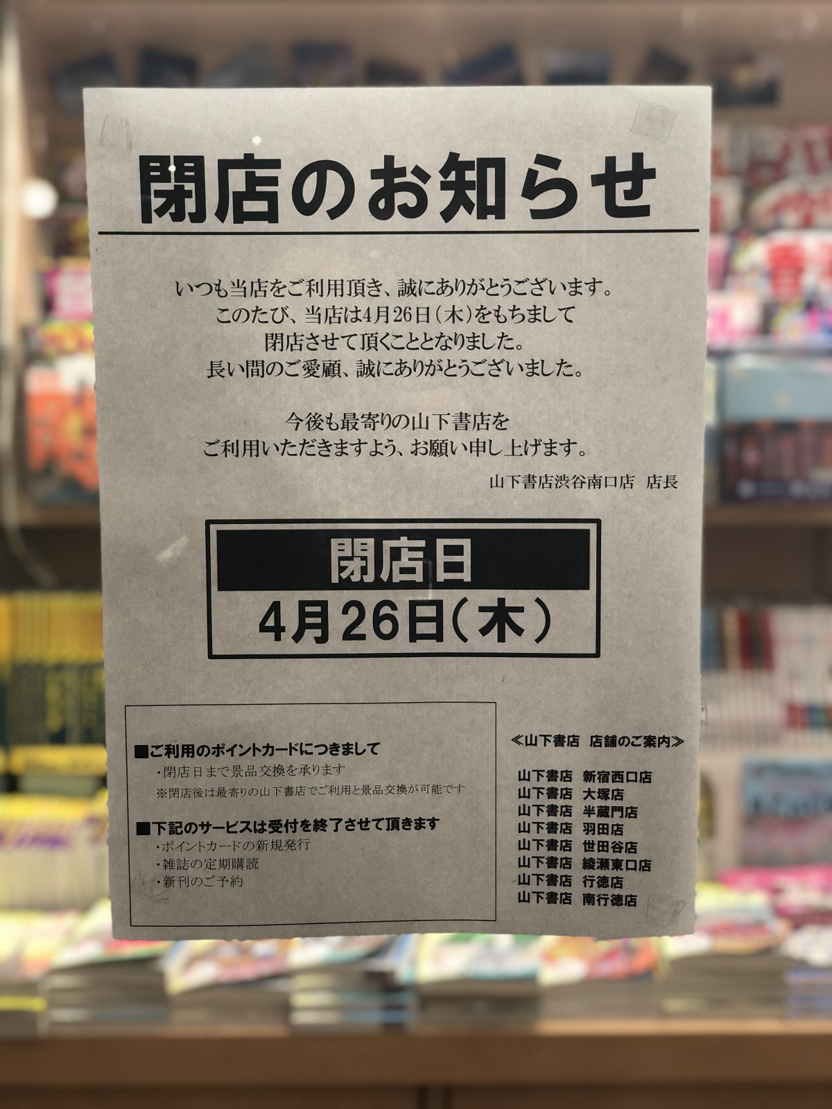 渋谷駅東口交差点の一角にある「山下書店渋谷南口店」(渋谷区渋谷3)が4月26日で閉店する。