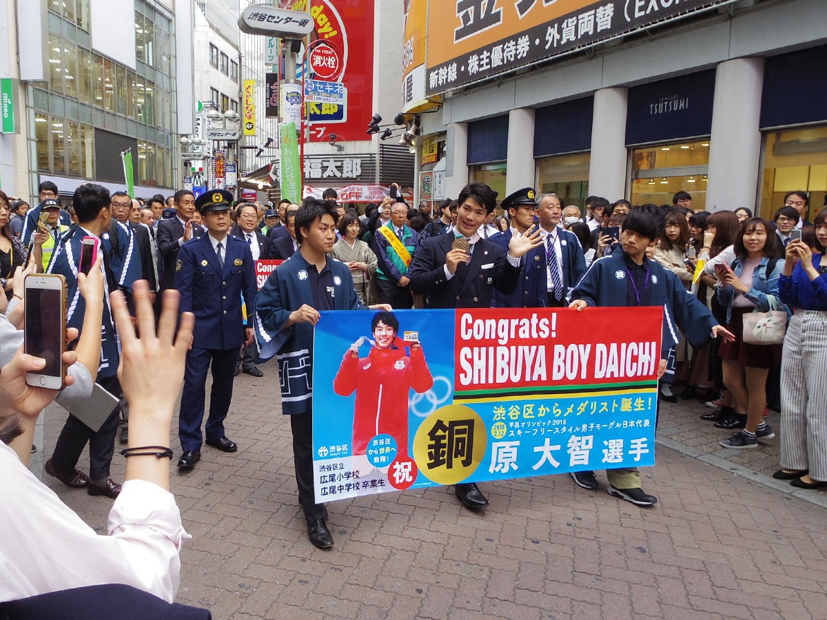 平昌冬季オリンピック大会で銅メダルを獲得したフリースタイルスキー男子モーグルの原大智選手が4月27日、地元・渋谷のセンター街・バスケットボールストリート(通称=バスケ通り)をパレードした。