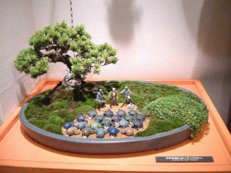 ご存じ「水戸黄門」の「葵の紋所の印籠」登場シーンも見事、小宇宙に再現。ザ・ワールド・オブ・マン盆栽展