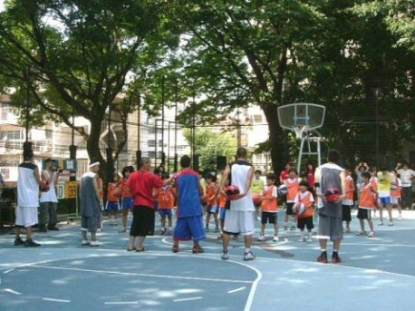 4日、美竹公園に寄贈された「ジョーダン・コート」のオープニングイベントで、小中学生向けのバスケットボール教室