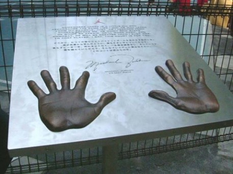 5日から一般開放された美竹公園「ジョーダン・コート」前に設置されたマイケル・ジョーダンの原寸大手形プレート
