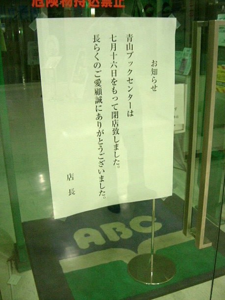 16日に営業を停止した「青山ブックセンター青山本店」の入り口に閉店を告げる張り紙。同店オープンは1996年
